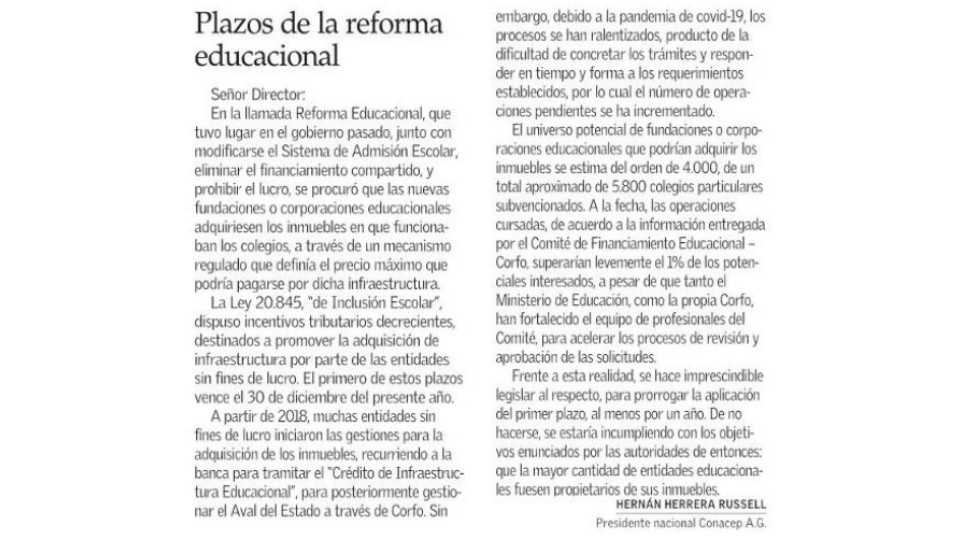 Hernán Herrera, presidente de la Corporación Nacional de Colegios Particulares de Chile (Conacep A.G.), concluye que si " llega a pasar lo que ha experimentado Europa, los sostenedores serán los primeros en retrotraer las medidas. En la medida que les demos seguridad a los padres, ellos mismos harán que sus hijos retornen al aula".
