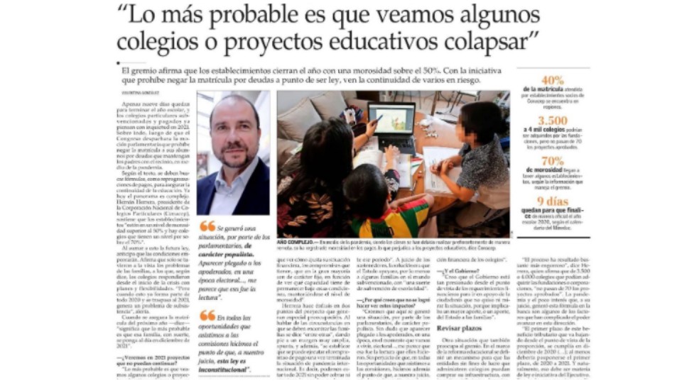 HERNÁN HERRERA, PRESIDENTE DE LA CORPORACIÓN DE COLEGIOS PARTICULARES, SOSTUVO QUE LA MEDIDA AFECTA " NO A LOS GRANDES ESTABLECIMIENTOS, SINO QUE A MILES DE PEQUEÑOS COLEGIOS DEL PAÍS, LOS QUE AHORA DEBERÁN MANEJAR SUS FINANZAS PAFA PODER SUSBSISTIR". EL DIRIGENTE DETALLÓ QUE EN LOS ESTABLECIMIENTOS PARTICULARES, LA MOROSIDAD DE LOS APODERADOS ALCANZA UN 50%, MIENTRAS QUE EN LOS COLEGIOS DEL SECTOR SUBVENCIONADO LLEGA A UN 70%,QUIENES DEBEN ALGUNAS CUOTAS O EL AÑO COMPLETO.